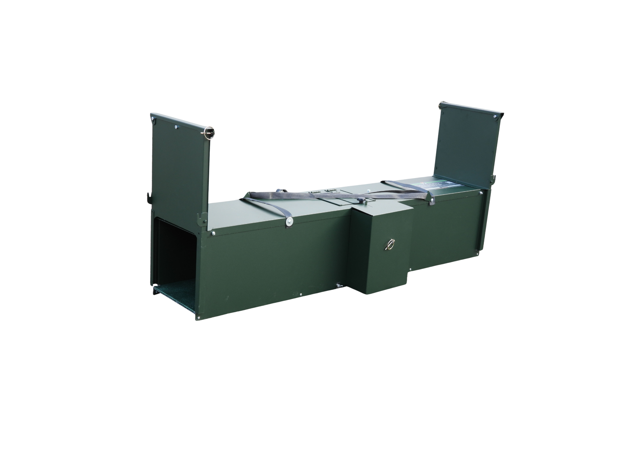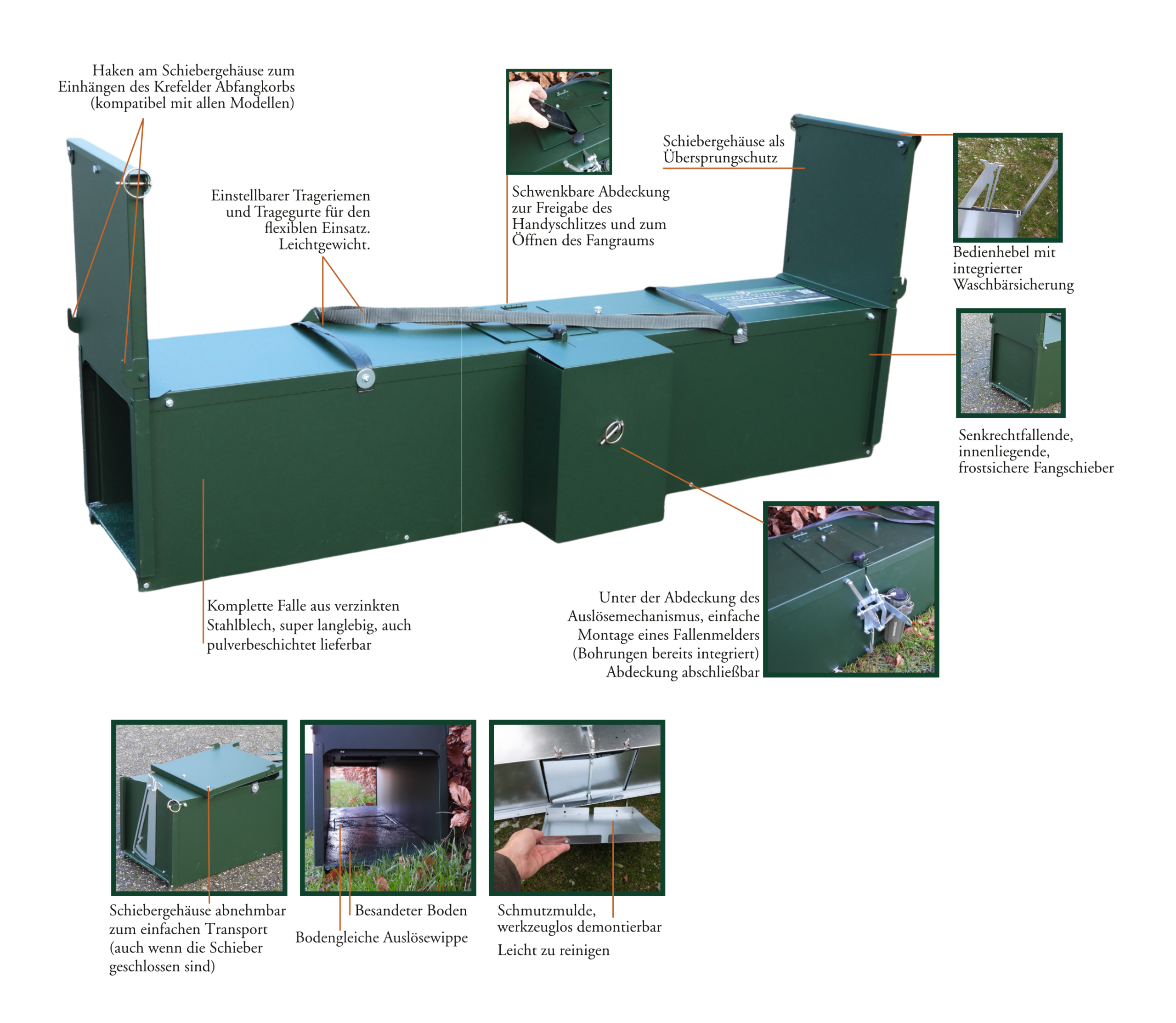 • leicht abnehmbare Schiebergehäuse zum einfachen, platzsparenden Transport, Schieber verbleiben gesichert an der Falle, (wenn nicht vor Ort abgefangen werden kann)
